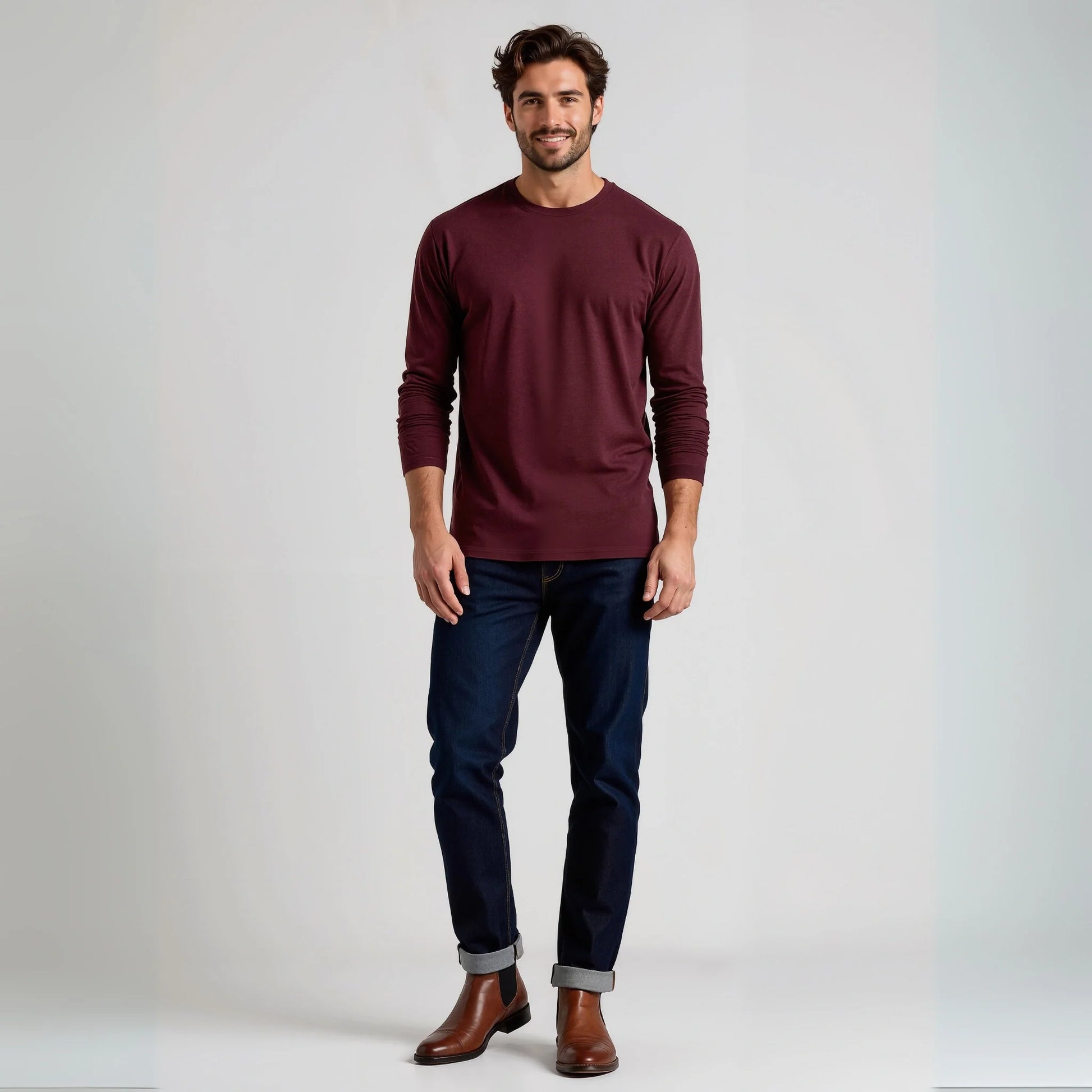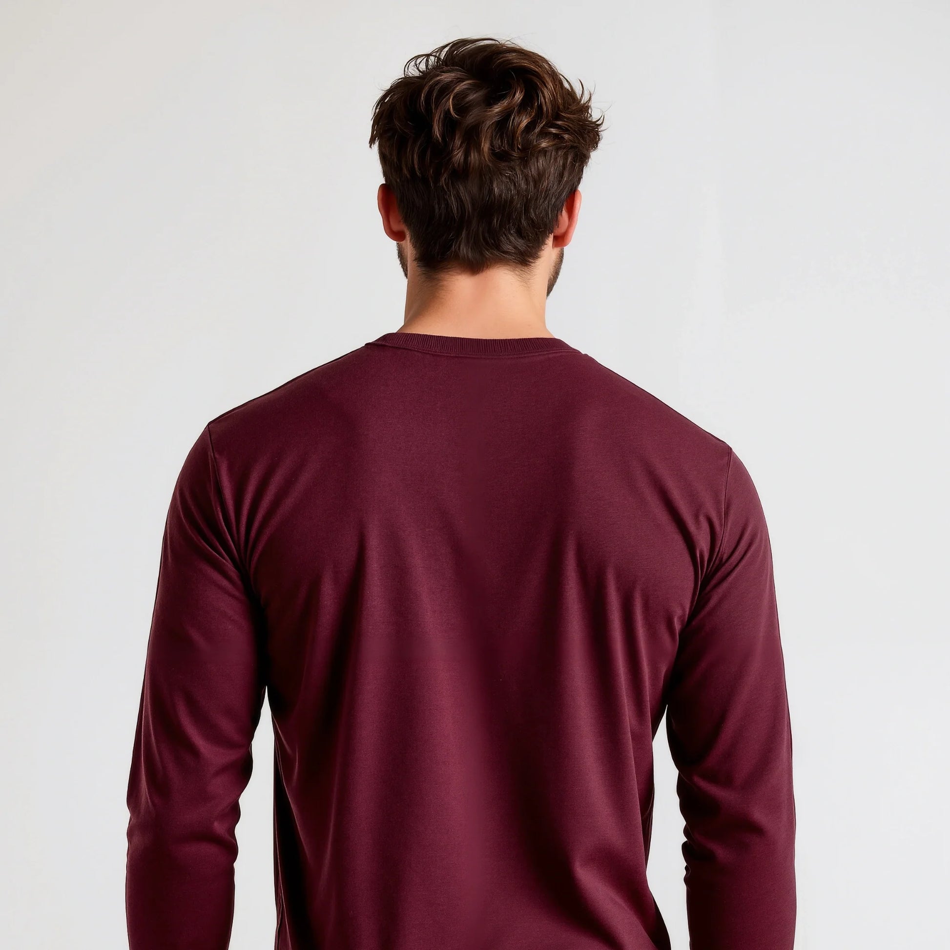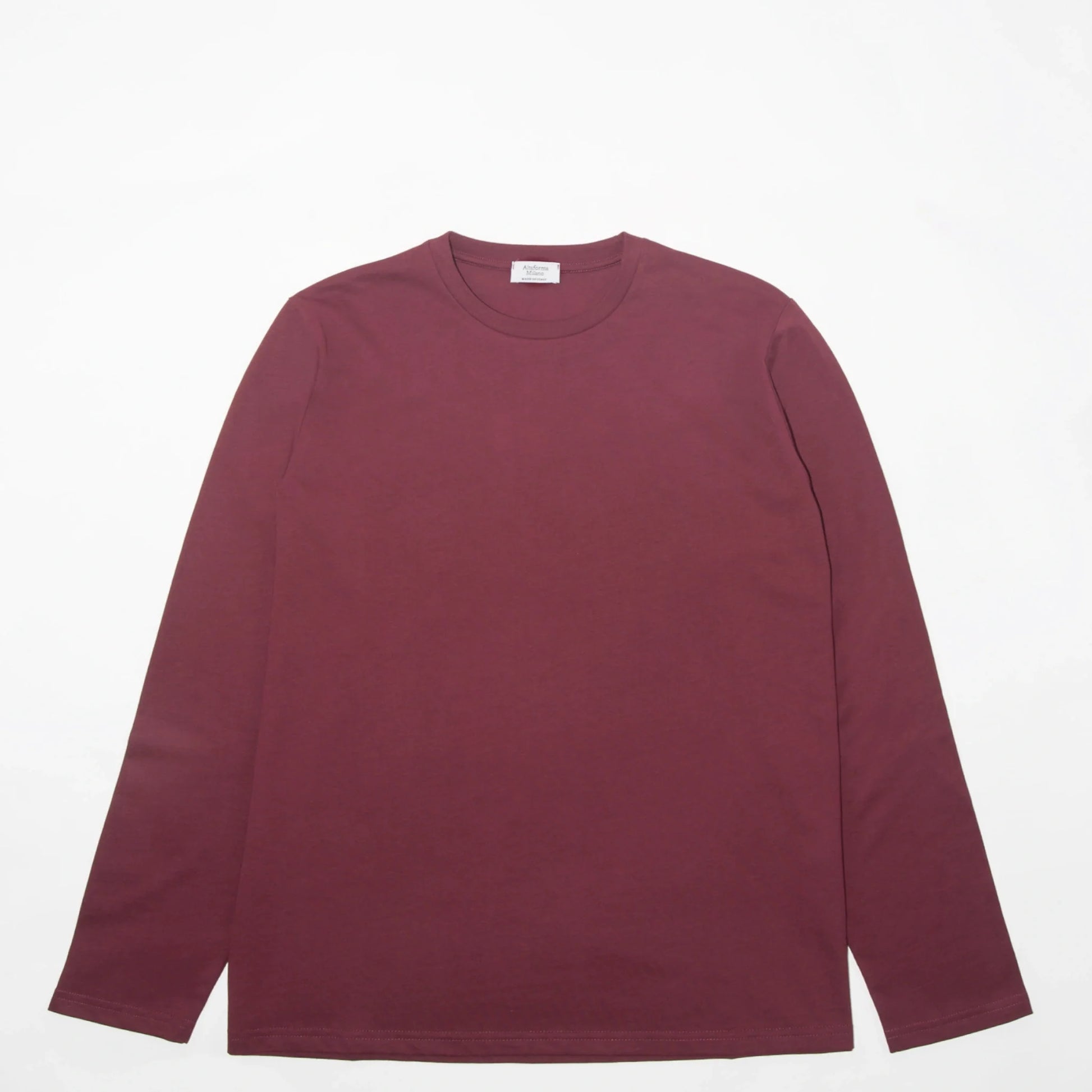 Il bordeaux in manica lunga è più invernale del bordeaux in manica corta. È un colore che appartiene alla stagione fredda — lana, cappotti, scarpe in pelle.