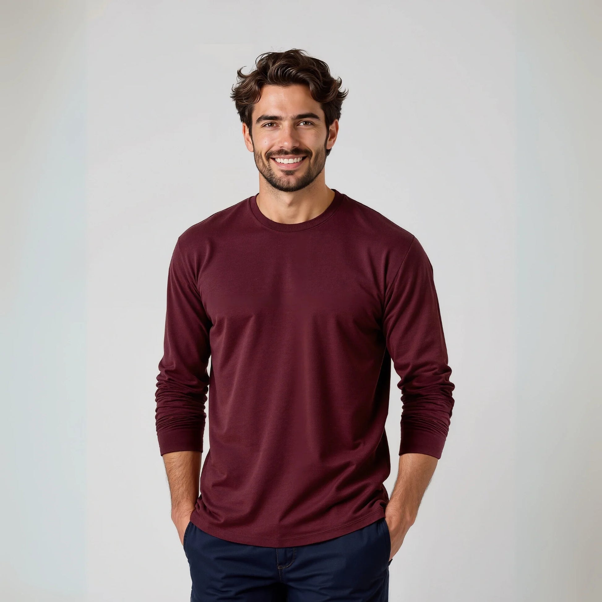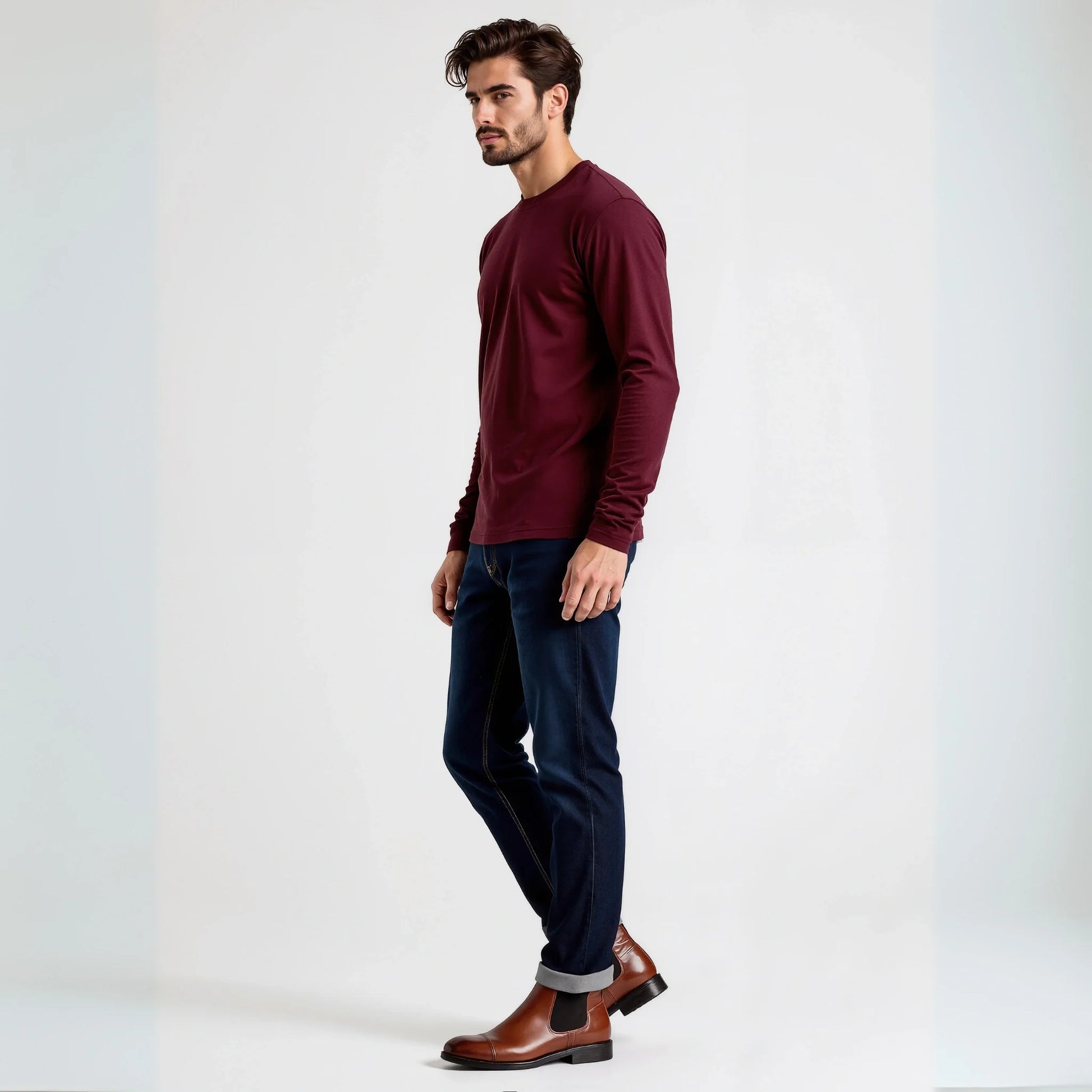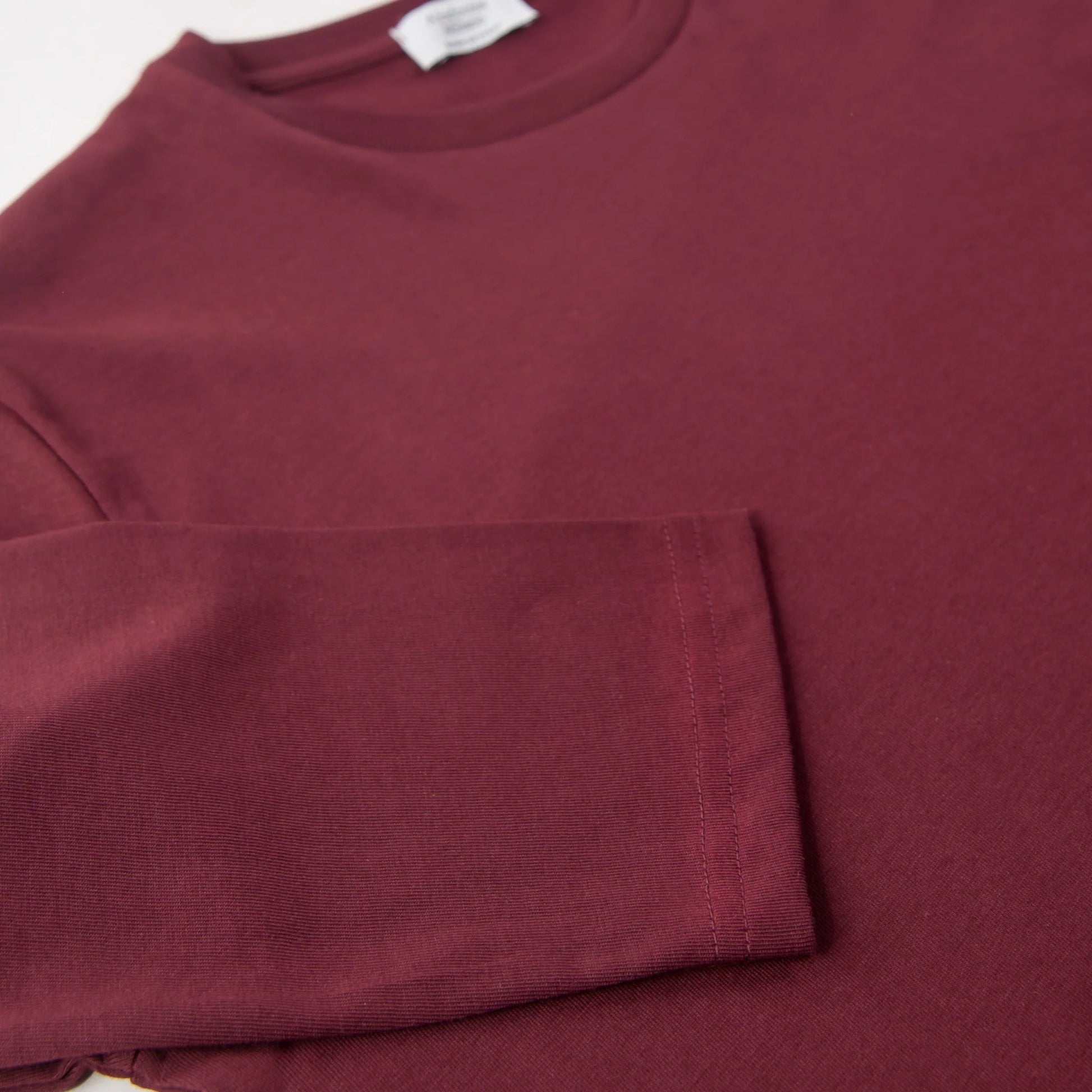 Il bordeaux in manica lunga è più invernale del bordeaux in manica corta. È un colore che appartiene alla stagione fredda — lana, cappotti, scarpe in pelle.