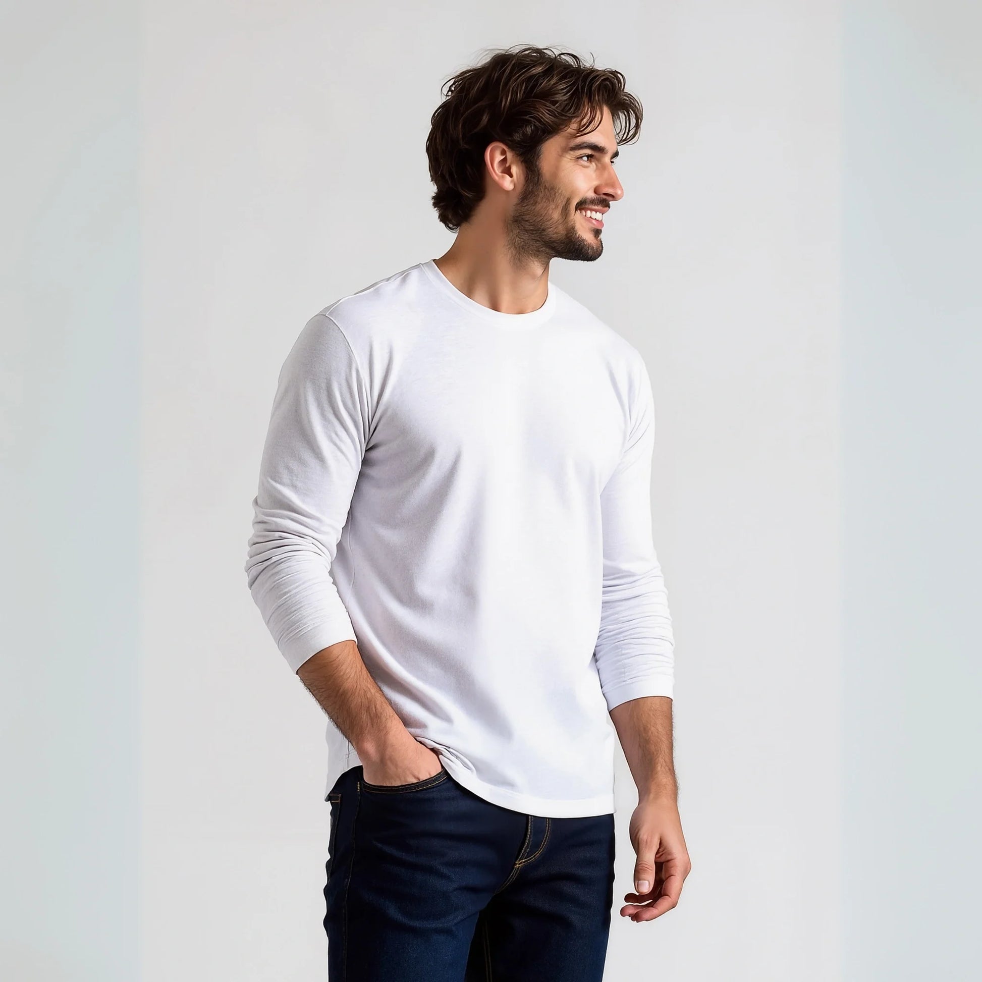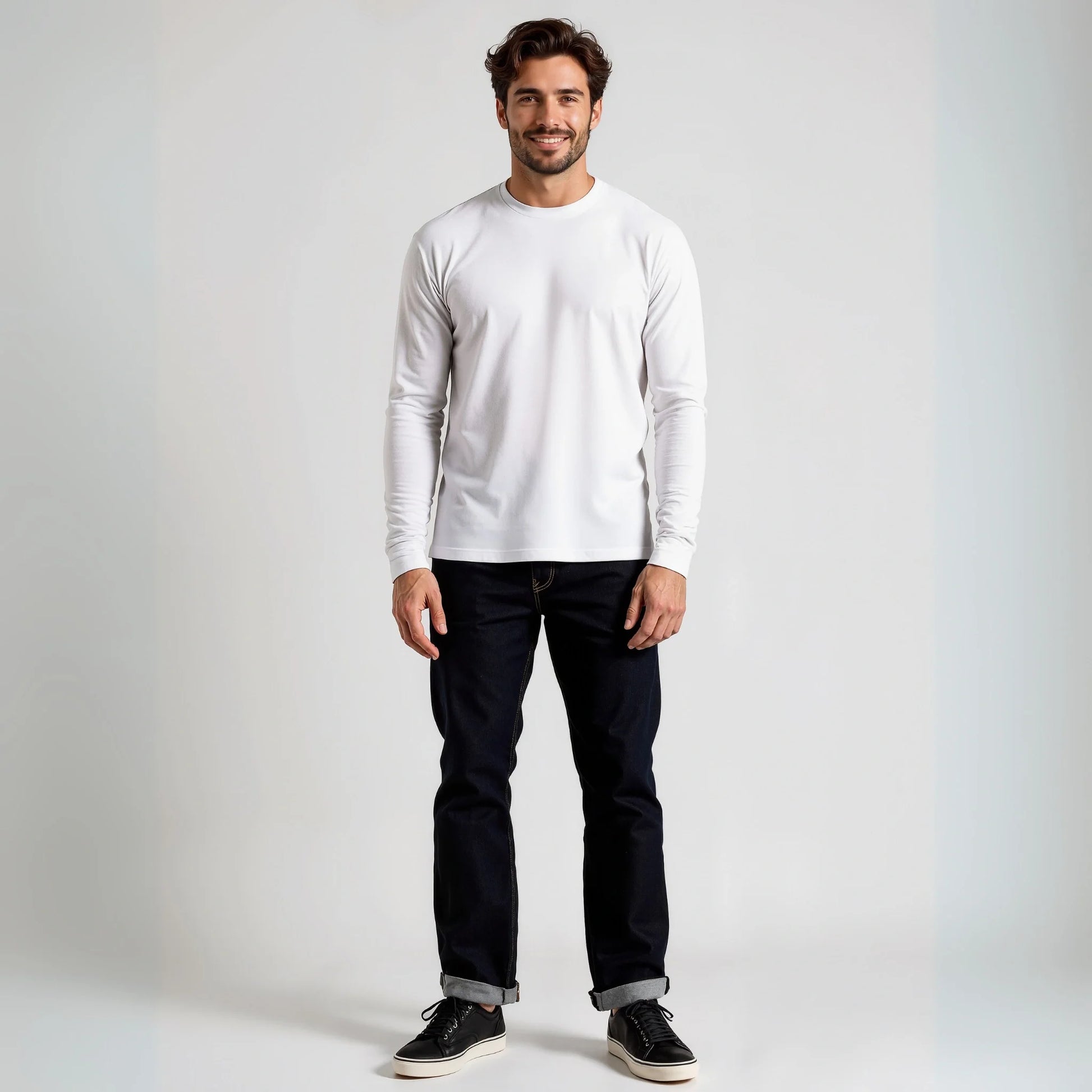 È il capo che porta luce all'outfit, che alleggerisce un layering autunnale altrimenti pesante. Sotto una giacca navy o grigia, una manica lunga bianca crea un contrasto pulito senza richiedere una camicia. Da sola, è abbastanza strutturata da non risultare trasparente.