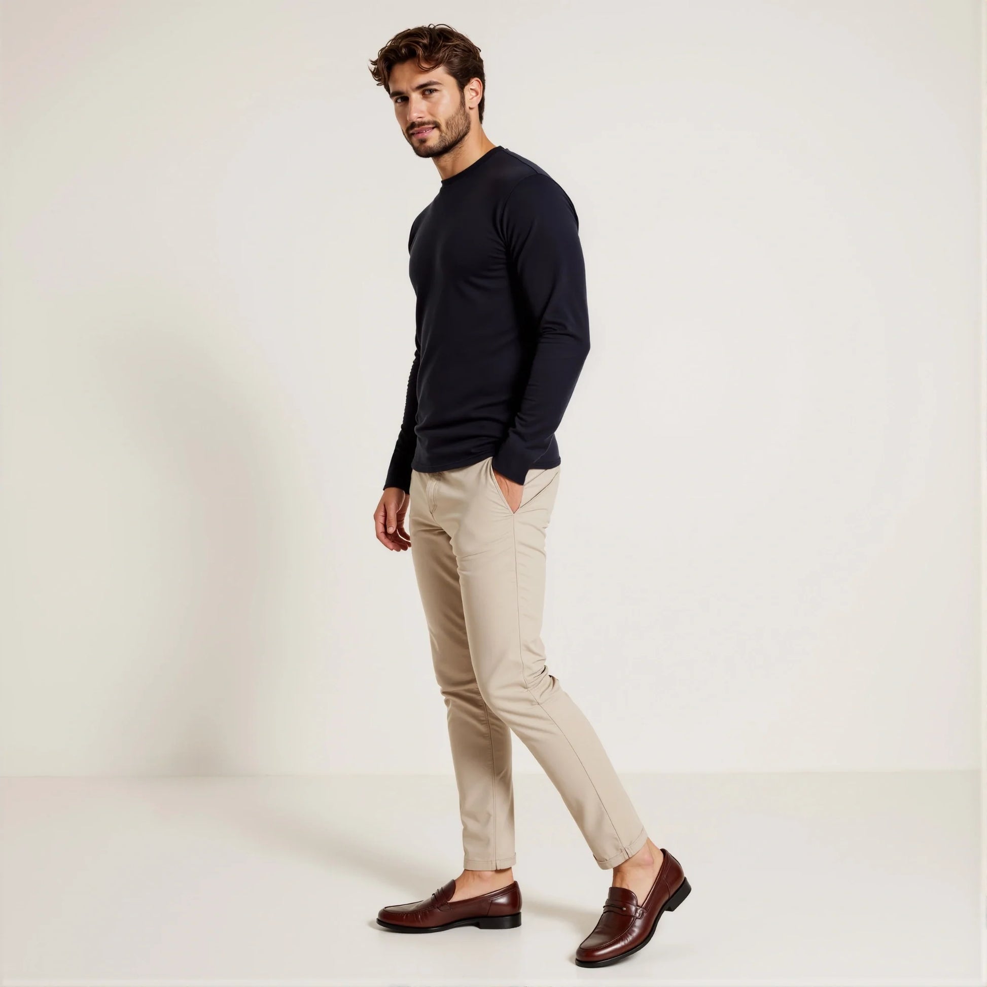 È il capo che sparisce nell'outfit lasciando spazio al resto: sotto una giacca strutturata, sotto un capospalla oversize, sotto una camicia di lino lasciata aperta. Non si vede, non distrae, non compete. Ma quando si porta da solo, regge perfettamente: un nero pieno che non sbiadisce, non si deforma, non fa pile.